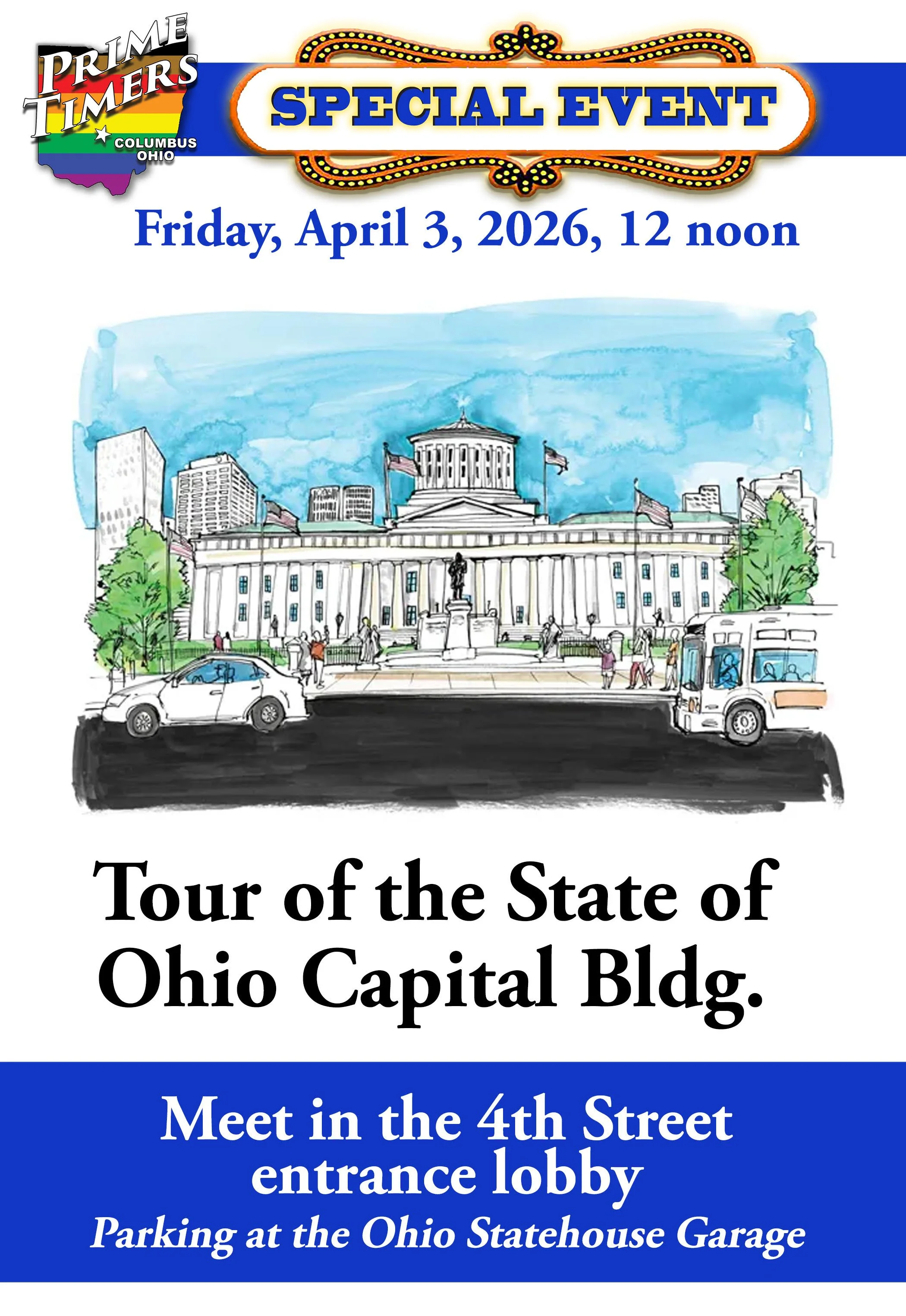 Back to All Events Tour of the State of Ohio Capital Bldg. Friday, April 3, 2026 12:00 PM 1:30 PM State of Ohio Capital Bldg. 4th Street Columbus, OH, 43219 United States (map) Google Calendar ICS See who is coming…